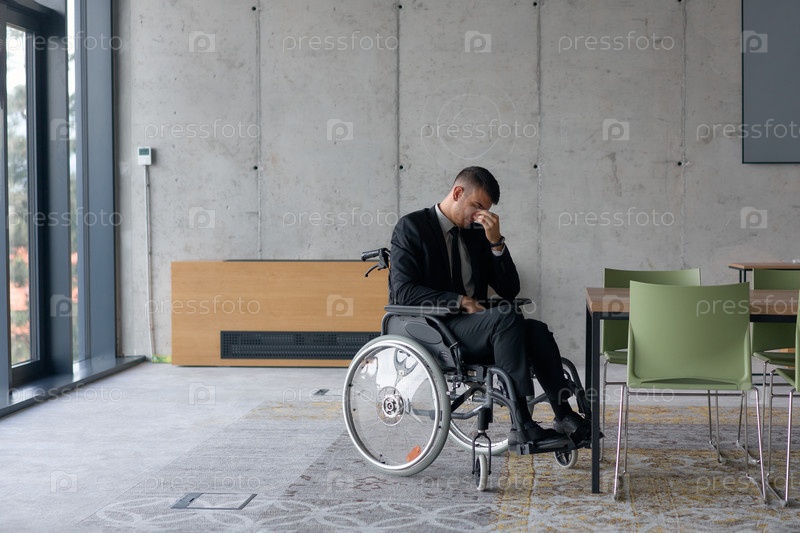 Грустный и подавленный директор в инвалидном кресле сидит один в большом офисе, размышляя о трудностях и изоляции, которые сопутствуют его профессиональным обязанностям