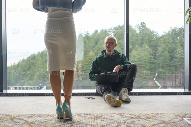 Светловолосый мужчина небрежно сидит на полу современного офиса, прислонившись к окну, и работает за ноутбуком, а его привлекательная коллега стоит рядом