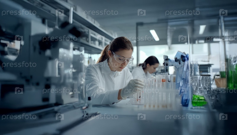 Разнообразная команда мужчин и женщин-ученых-медиков, работающих над новыми фармацевтическими продуктами в современной лаборатории. Сгенерированное изображение