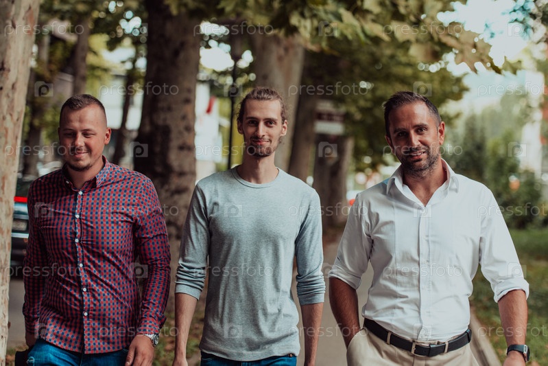 После продуктивного рабочего дня группа коллег из разных слоев общества наслаждается неторопливой прогулкой по современному и естественному городскому ландшафту