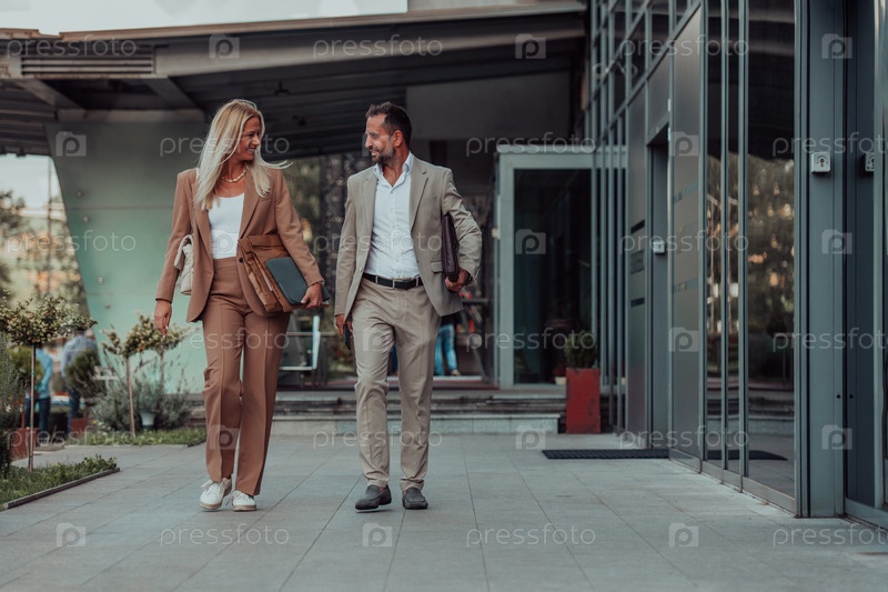 Современная деловая пара после долгого рабочего дня вместе направляется к своему уютному дому, воплощая идеальное сочетание профессионального успеха и личного удовлетворения