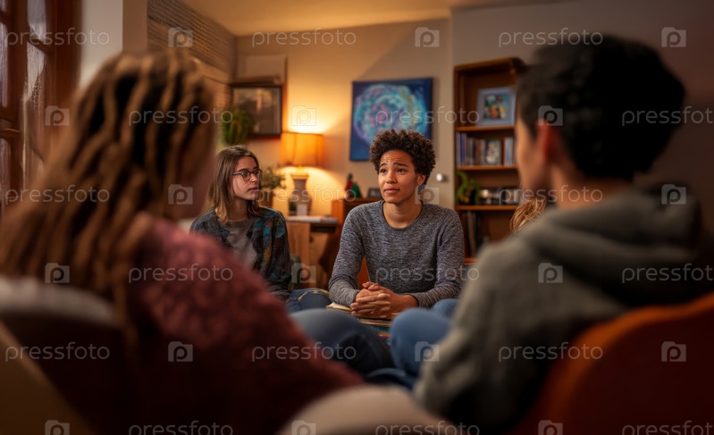 Школьный психолог консультирует разнообразную группу подростков во время сеанса терапии. Сгенерированное изображение