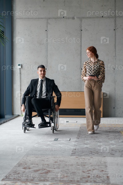 Директор в инвалидной коляске перемещается по офису, обсуждая деловые вопросы с коллегой