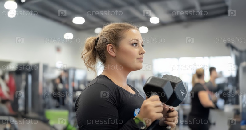 Женщина плюс-size поднимает гантели и тренируется в тренажерном зале, демонстрируя силу и решимость