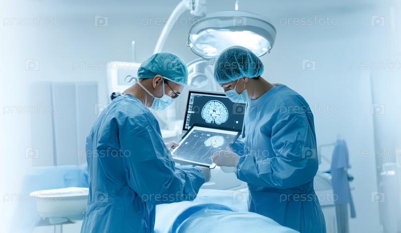 Врач и невролог используют роботизированную технологию с программным обеспечением ИИ для исследования мозга пациента. Сгенерированное изображение