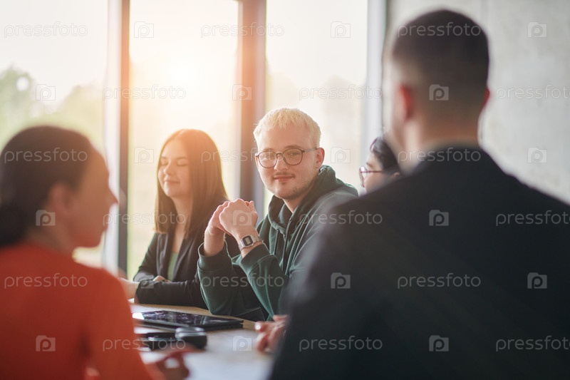 Разнообразная многонациональная бизнес-команда участвует в совместной встрече, обсуждая стратегии и решения в современной офисной обстановке