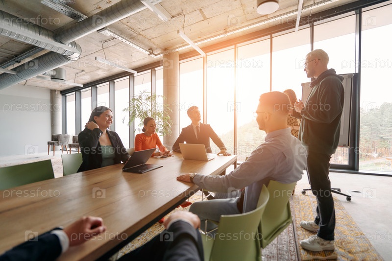 Разнообразная многонациональная бизнес-команда участвует в совместной встрече, обсуждая стратегии и решения в современной офисной обстановке