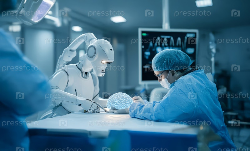 Врач и невролог используют роботизированную технологию с программным обеспечением ИИ для исследования мозга пациента. Сгенерированное изображение