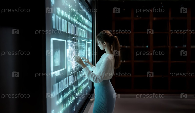 Молодой студент использует технологию голограмм и искусственный интеллект для поиска книги в библиотеке. Сгенерированное изображение