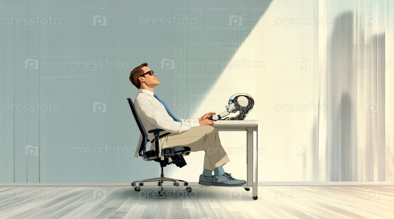 Счастливый человек в офисе, работающий вместе с роботом-помощником для повышения производительности. Сгенерированное изображение