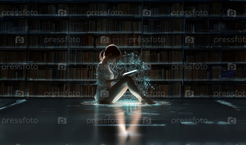 Молодой студент использует технологию голограмм и искусственный интеллект для поиска книги в библиотеке. Сгенерированное изображение