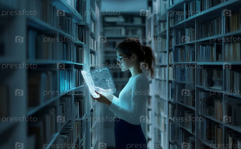 Молодой студент использует технологию голограмм и искусственный интеллект для поиска книги в библиотеке. Сгенерированное изображение
