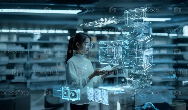 Молодой студент использует технологию голограмм и искусственный интеллект для поиска книги в библиотеке. Сгенерированное изображение