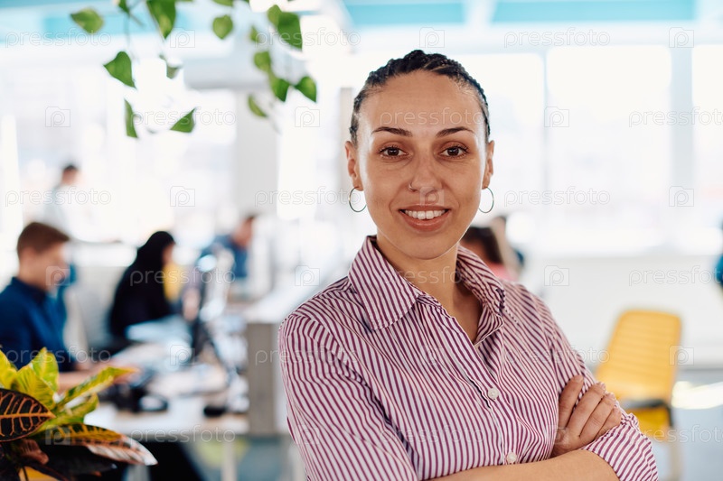 Портрет молодой улыбающейся деловой женщины в креативном открытом пространстве коворкинга стартап-офиса. Успешная бизнес-леди стоит в офисе с копирайтом. Коллеги, работающие на заднем плане