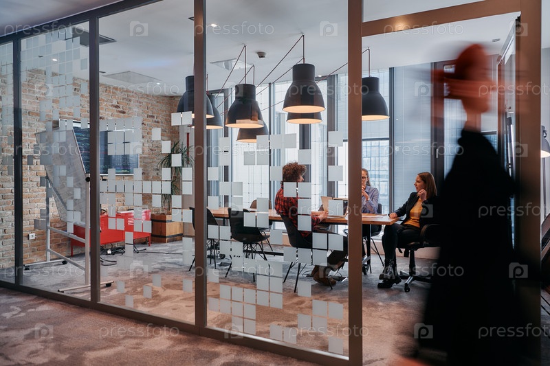В динамичной суете деловой среды группа молодых специалистов идет по коридору рядом со своим офисом, в то время как их коллеги сотрудничают внутри, что символизирует командную работу и производительность