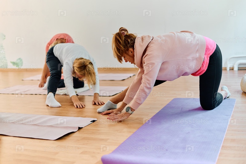 Группа пожилых женщин занимается различными упражнениями йоги, включая растяжку шеи, спины и ног, под руководством тренера в залитом солнцем месте, способствуя благополучию и гармонии