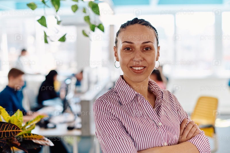 Портрет молодой улыбающейся деловой женщины в креативном открытом пространстве коворкинга стартап-офиса. Успешная бизнес-леди стоит в офисе с копирайтом. Коллеги, работающие на заднем плане