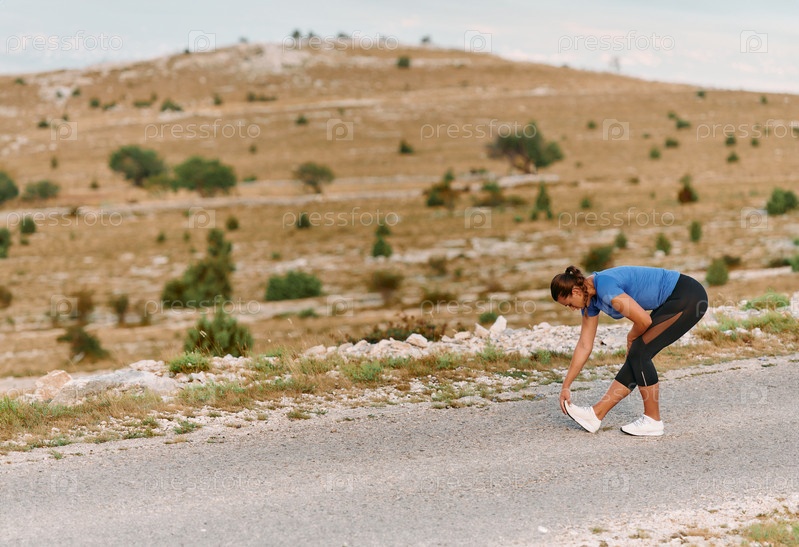 Решительная спортсменка делает растяжку после интенсивной пробежки по пересеченной горной местности