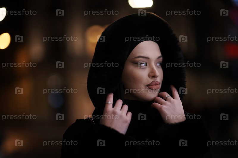 Мусульманка идет по городской улице холодной зимней ночью в хиджабе