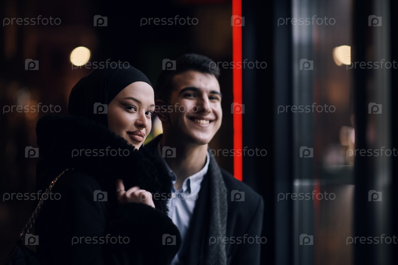 Счастливая мультикультурная деловая пара прогуливается вместе на улице города ночью возле витрины ювелирного магазина