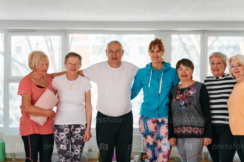 Группа пожилых людей и один мужчина с удовольствием позируют со своим инструктором по йоге после успешной тренировки