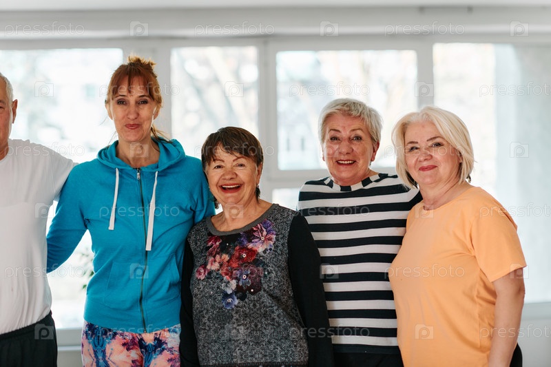 Группа пожилых людей и один мужчина с удовольствием позируют со своим инструктором по йоге после успешной тренировки
