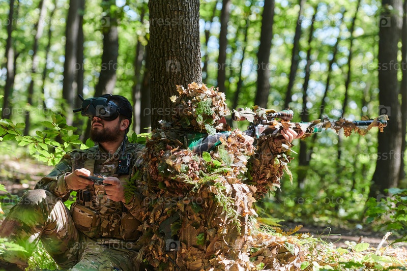 Опытный снайпер и солдат, управляющий дроном с очками виртуальной реальности, разрабатывают стратегию и наблюдают за военными действиями, скрываясь в лесу