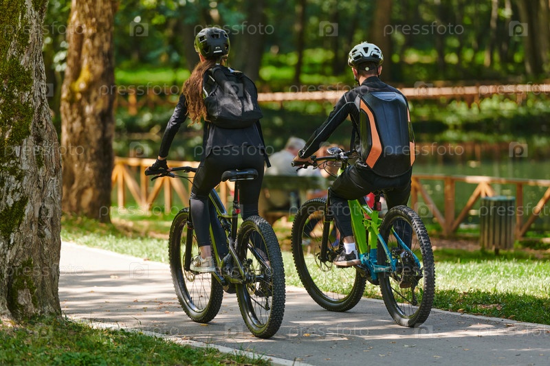 Счастливая пара, одетая в профессиональную велосипедную экипировку, наслаждается романтической велопрогулкой по парку, окруженному современными природными достопримечательностями, излучая любовь и счастье