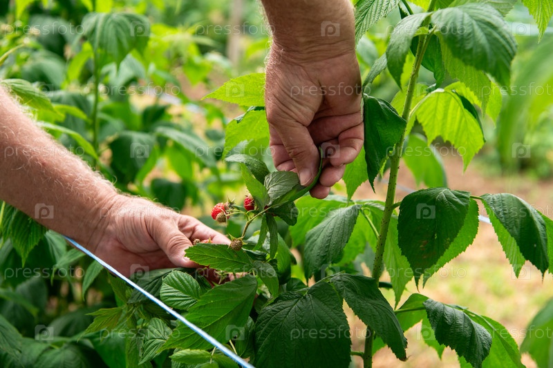 Сбор свежей спелой малины вручную в залитом солнцем саду