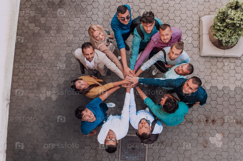 Фотография сверху, на которой изображена группа деловых людей и коллег, стоящих вместе, держась за руки и смотрящих в камеру, что символизирует единство и командную работу