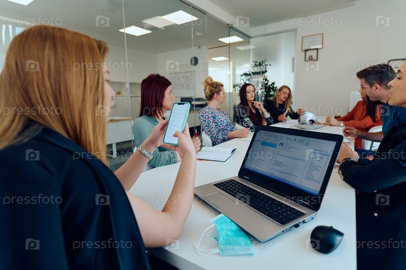 Разнообразная бизнес-группа обсуждает проекты в современном стеклянном офисе