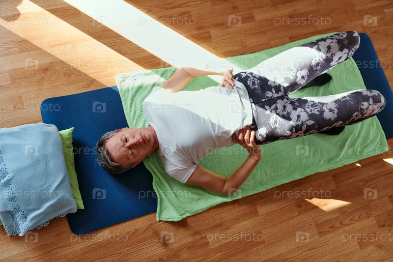 Пожилая женщина практикует растяжку и медитацию на полу, уделяя особое внимание правильному выравниванию и расслаблению