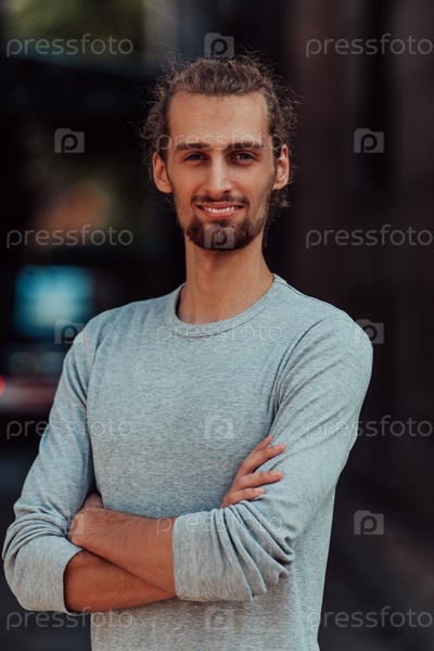Портрет молодого успешного бизнесмена со скрещенными руками перед компанией