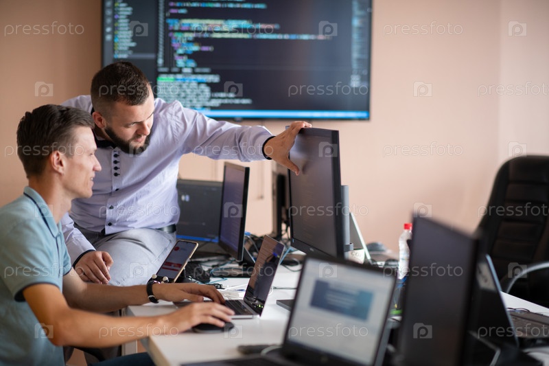 Программисты, погруженные в тесное сотрудничество, усердно работают вместе над решением сложных проблем