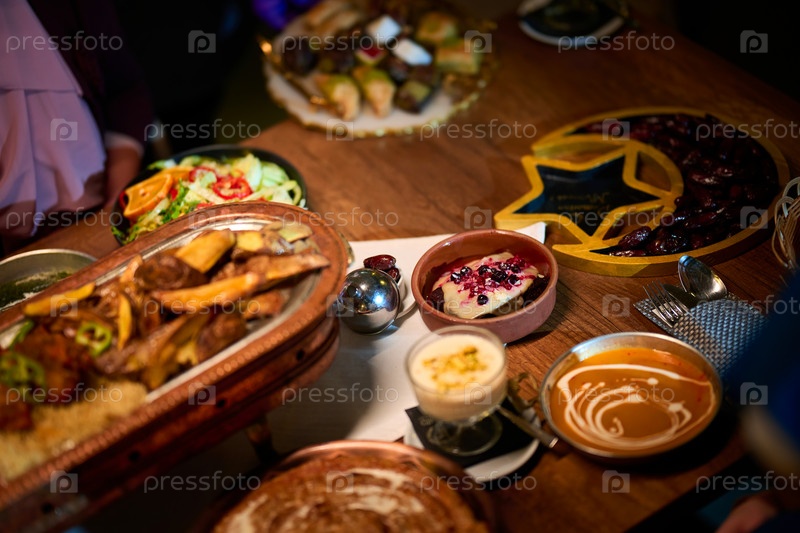 На этом захватывающем виде сверху вкусная еда, украшенная в стиле Рамадана, включая финики и мясо, ожидает прибытия европейской исламской семьи, обещающей праздничное и ароматное празднование ифтара