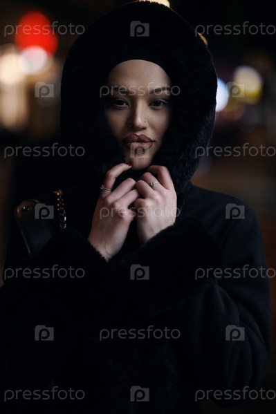 Мусульманка идет по городской улице холодной зимней ночью в хиджабе