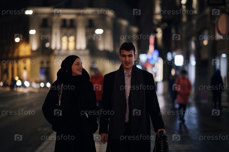 Счастливая мультикультурная деловая пара прогуливается вместе на улице города ночью возле витрины ювелирного магазина