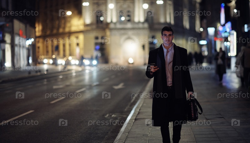 Улыбающийся мужчина с Востока идет по улице возле современного офисного здания,