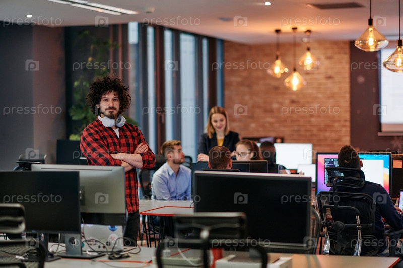 Стратегическая бизнес-встреча: группа профессионалов, работающих в офисе с использованием компьютеров