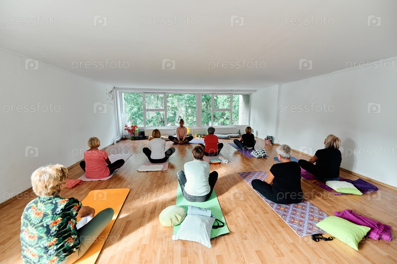 Группа пожилых женщин занимается различными упражнениями йоги, включая растяжку шеи, спины и ног, под руководством тренера в залитом солнцем месте, способствуя благополучию и гармонии