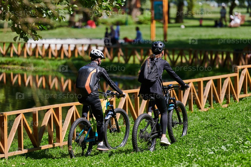 Счастливая пара, одетая в профессиональную велосипедную экипировку, наслаждается романтической велопрогулкой по парку, окруженному современными природными достопримечательностями, излучая любовь и счастье