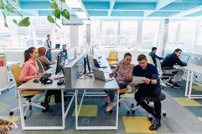 Совместный процесс многонациональной квалифицированной молодой бизнес-команды во время мозгового штурма в офисе. Разнообразная группа молодых людей, одетых в официальную одежду, сотрудничает в разработке дизайн-проекта