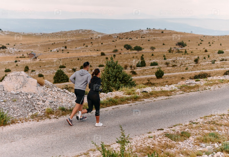 Пара в спортивной одежде бежит по живописной дороге во время утренней тренировки, наслаждаясь свежим воздухом и поддерживая здоровый образ жизни