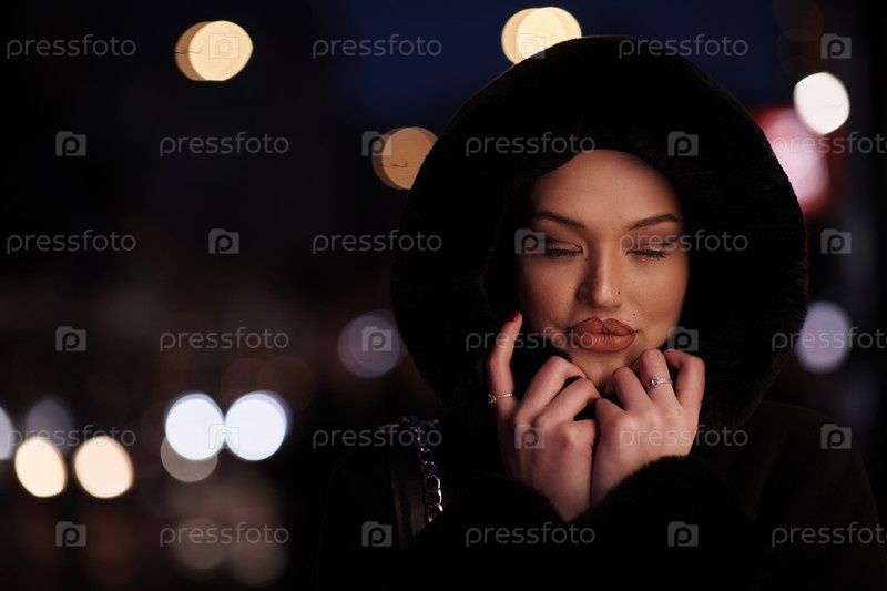 Мусульманка идет по городской улице холодной зимней ночью в хиджабе