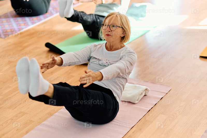 Группа пожилых женщин занимается различными упражнениями йоги, включая растяжку шеи, спины и ног, под руководством тренера в залитом солнцем месте, способствуя благополучию и гармонии