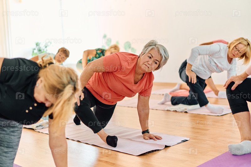 Группа пожилых женщин занимается различными упражнениями йоги, включая растяжку шеи, спины и ног, под руководством тренера в залитом солнцем месте, способствуя благополучию и гармонии