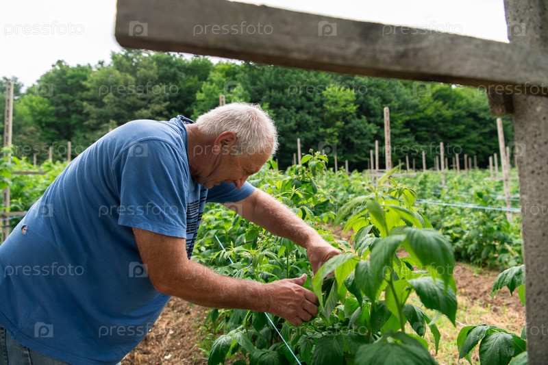 Пожилой фермер собирает свежую спелую малину в залитом солнцем саду