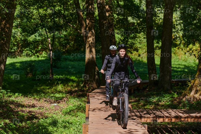 Счастливая пара, одетая в профессиональную велосипедную экипировку, наслаждается романтической велопрогулкой по парку, окруженному современными природными достопримечательностями, излучая любовь и счастье