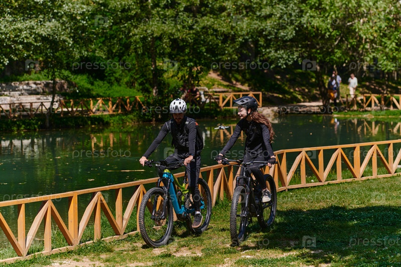 Счастливая пара, одетая в профессиональную велосипедную экипировку, наслаждается романтической велопрогулкой по парку, окруженному современными природными достопримечательностями, излучая любовь и счастье
