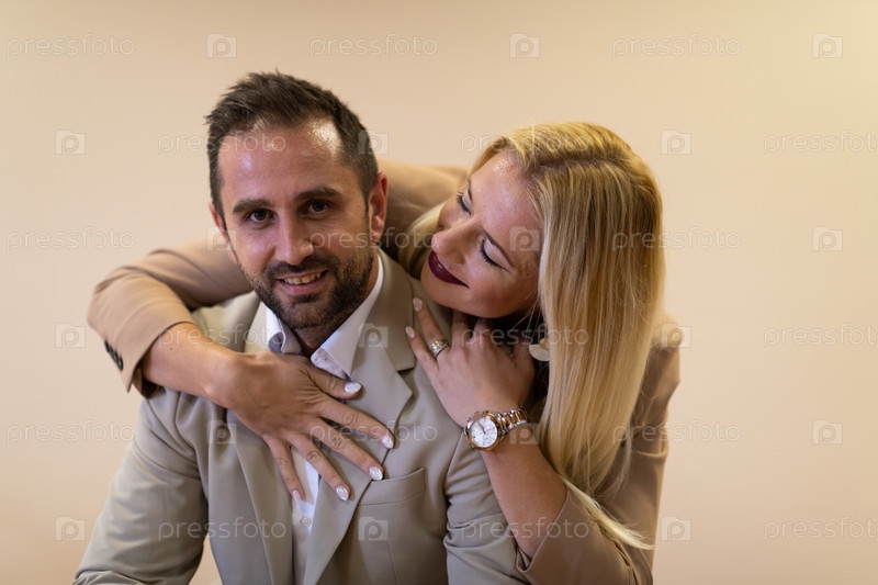 Пара бизнесменов позирует для совместной фотографии на бежевом фоне, запечатлевая свое профессиональное партнерство и создавая вневременной образ единства и успеха